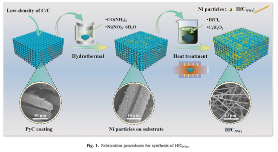HfC纳米线的生长:将Ni涂层的碳纤维浸入PFA/Hf溶液中,经过干燥和固化处理后,在真空炉中于1500°C下进行热解,最终在碳纤维上生长出HfC纳米线。