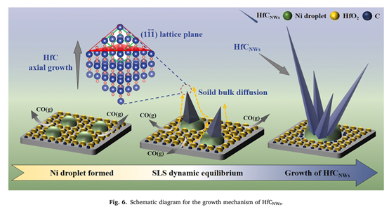 生长机制:HfC纳米线的生长遵循固-液-固(SLS)机制,Ni催化剂在纳米线的根部固定,纳米线从金属液滴中生长出来。
