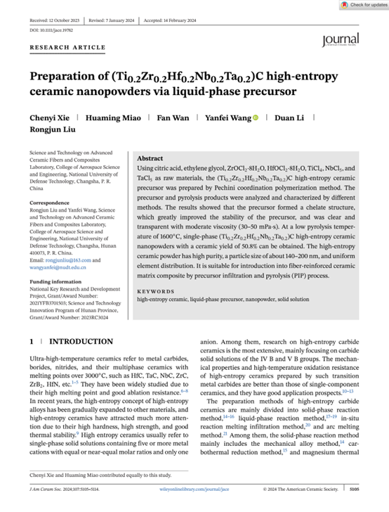然而,传统固相反应法(如机械合金化、高温烧结)需依赖2000℃以上的超高温环境,且易导致元素分布不均、颗粒粗大等问题。如何实现低温合成与纳米级均匀性的统一,成为国际学界的技术难点。国防科技大学航空航天科学与工程学院的谢晨熠、缪华明等科研团队提出液相前驱体法,通过分子级设计攻克了这一难题。