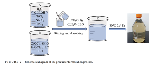 研究团队创新性地采用Pechini配位聚合法,以柠檬酸、乙二醇和金属氯化物(TaCl5、NbCl5、ZrOCl₂、HfOCl₂等)为原料,构建了具有螯合结构的液态前驱体。该前驱体具有以下显著优势: