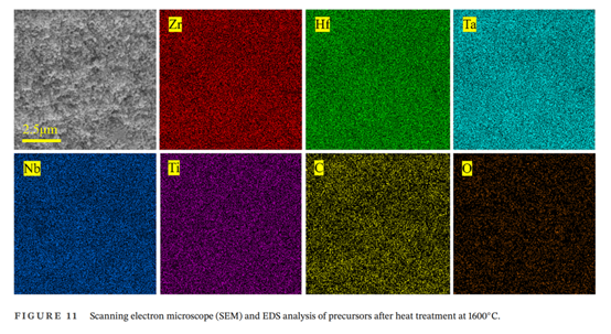 元素分布:EDS面扫描结果(Ti、Zr、Hf、Nb、Ta、C、O的分布图)证实五种金属元素在微米尺度上均匀分布,无局部偏析现象,氧含量仅为1.23 wt%,符合高熵陶瓷的固溶体设计要求。