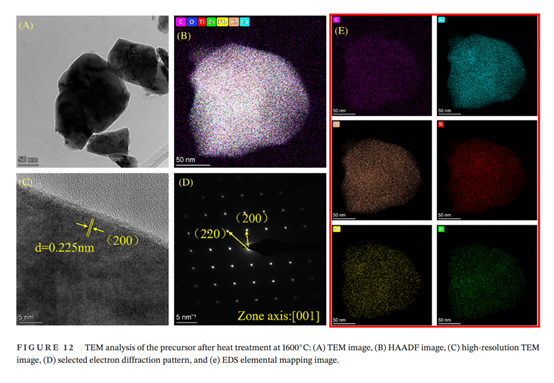 图12D的选区电子衍射(SAED)呈现面心立方(FCC)结构的衍射斑点,证明高熵陶瓷继承了单组元碳化物的晶体结构。