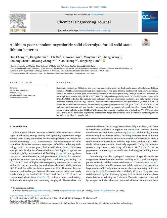 近期,中国矿业大学与深圳大学联合团队在《Chemical Engineering Journal》发表了一项关于新型固态电解质的突破性研究。他们以碳酸锂和超纯五氯化钽(TaCl5)为原料,通过机械球磨法成功合成了一种锂贫乏钽氧氯化物固态电解质(0.5Li₂O-TaCl₅),其室温离子电导率高达8.54×10⁻³ S cm⁻¹,创下了同类材料的最高纪录。这种电解质采用创新的锂贫乏设计(Li/阴离子比仅0.182),通过引入氧元素形成非晶结构,构建了丰富的锂离子迁移通道。材料表征显示,Ta-Cl和Ta-O键的协同作用不仅稳定了非晶网络,还降低了锂离子迁移能垒(活化能0.244 eV)。更值得注意的是,其3.28 g cm⁻³的超高压实密度确保了与电极的紧密接触,为解决固态电池界面阻抗难题提供了新方案。