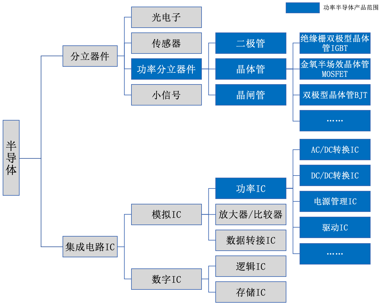 图 1 功率半导体类别及在半导体中的范围,资料来源:华润微招股说明书等。